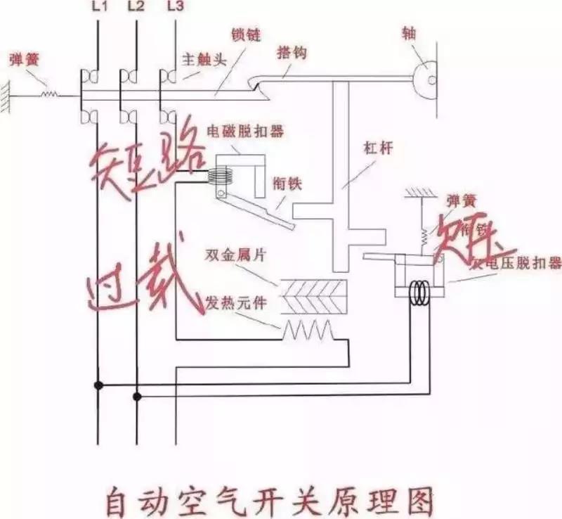 空氣開關(guān)的原理:空氣開關(guān)入線和出線間串了個(gè)十幾到二十圈的電感,電流足夠時(shí)吸合帶動(dòng)機(jī)械杠桿動(dòng)作保護(hù)。
