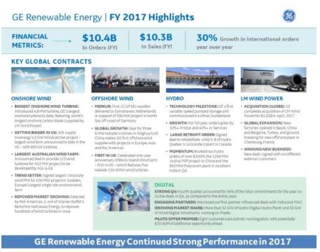 本周,通用電氣公布2017年財報稱,2017年可再生能源業(yè)績表現(xiàn)搶眼,訂單總額達(dá)到103億美元。