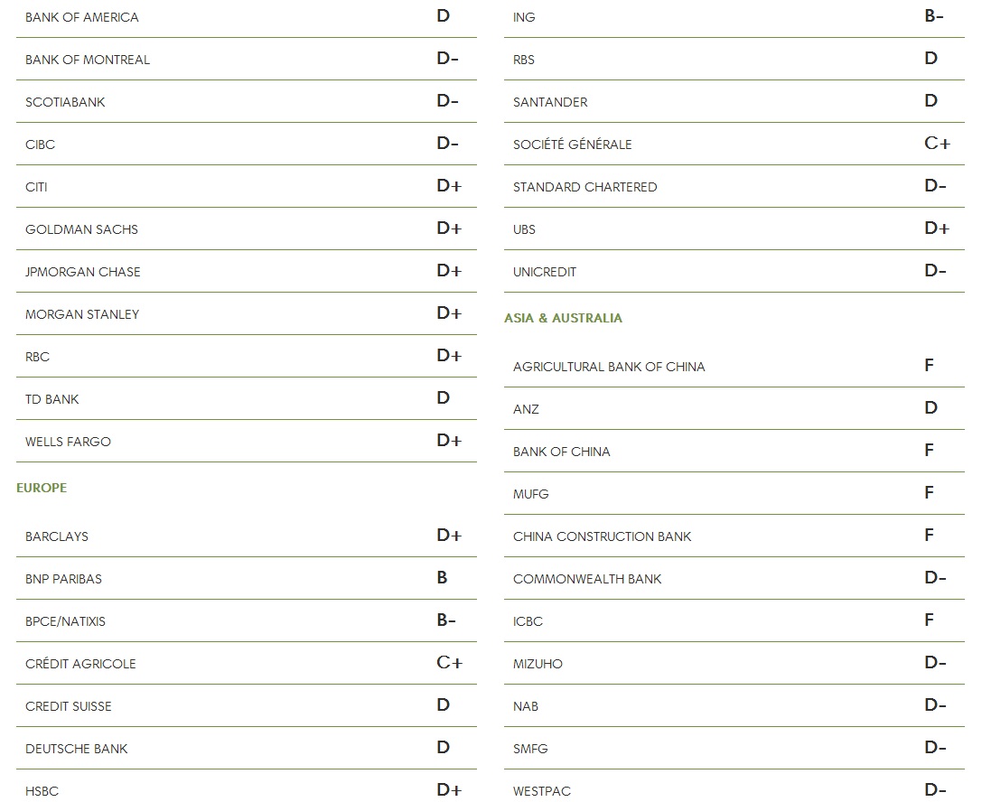 該報告評估了來自澳大利亞,加拿大,中國,歐洲,日本和美國的36家私人銀行(以及來自其他銀行和新加坡的政策),并在六個特定行業(yè)的報告上對銀行進行評級,這六個特定行業(yè)分別是焦油砂,極地石油,超深海石油,液化天然氣出口,煤炭開采和煤炭發(fā)電。