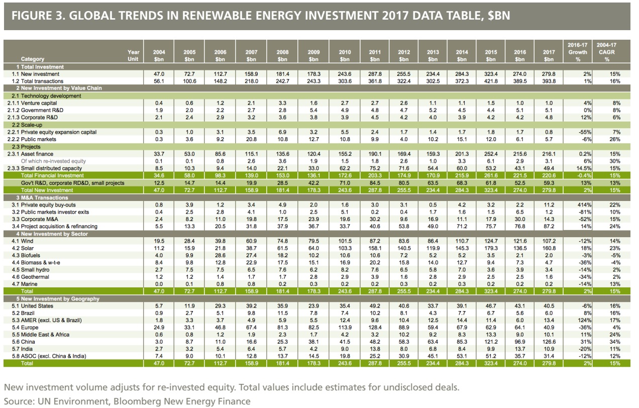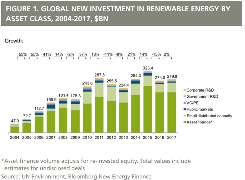 該報(bào)告稱,2017年是可再生能源投資超過2000億美元的連續(xù)第八年。