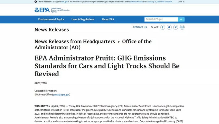 4月2日,美國環(huán)境保護(hù)局長斯科特·普魯伊特發(fā)表聲明稱,奧巴馬政府時期制定的汽車油耗標(biāo)準(zhǔn)過高,美國環(huán)境保護(hù)局(EPA)將和美國國家公路交通安全管理局(NHTSA)聯(lián)手制定新標(biāo)準(zhǔn)。