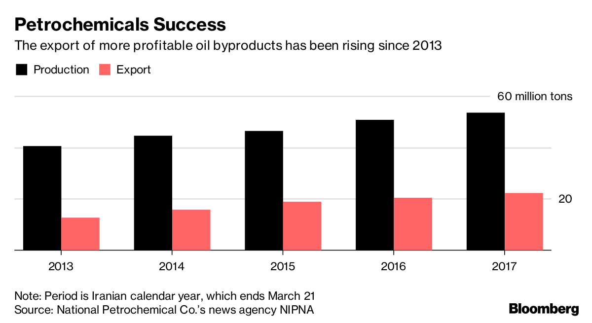 自2013年以來,伊朗的石化產(chǎn)品(包括乙烯,甲醇和化肥)的出貨量幾乎翻了一番。截至3月21日的12個(gè)月中,伊朗的總產(chǎn)量為5360萬(wàn)噸,但該國(guó)的總產(chǎn)量低于沙特基礎(chǔ)工業(yè)公司2017年的7,120萬(wàn)噸產(chǎn)能。