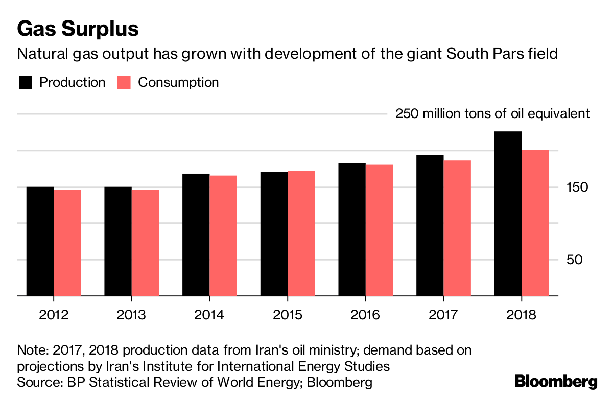 根據(jù)BP Plc的數(shù)據(jù),至少自2012年以來,天然氣生產(chǎn)和消費(fèi)量每年都在攀升。伊朗位居世界最大的天然氣儲(chǔ)量。該國(guó)在國(guó)內(nèi)使用燃料,并將其重新注入油田,以提高老化油藏的產(chǎn)量。