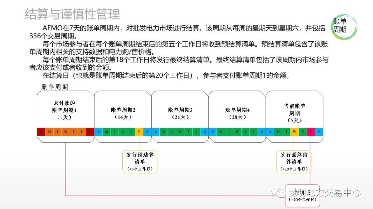 有機(jī)的“交易-計(jì)量-結(jié)算”協(xié)調(diào)配合機(jī)制。澳大利亞國(guó)家電力市場(chǎng)是一個(gè)電力現(xiàn)貨批發(fā)市場(chǎng),調(diào)度周期為5分鐘,交易周期為30分鐘,按周進(jìn)行結(jié)算,交易-計(jì)量-結(jié)算的協(xié)調(diào)配合使得市場(chǎng)運(yùn)行較為順暢。