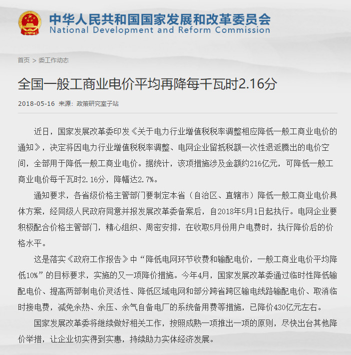 近日,國家發(fā)改委發(fā)布《全國一般工商業(yè)電價平均再降每千瓦時2 16分》。因電力行業(yè)增值稅稅率調(diào)整、電網(wǎng)企業(yè)留抵稅額一次性退返騰出的電價空