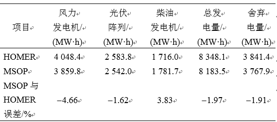 從運(yùn)行數(shù)據(jù)來看,兩款軟件配置的運(yùn)行電量差異均很小。除了柴油發(fā)電機(jī)年發(fā)電量MSOP略大于HOMER,風(fēng)電和光伏年發(fā)電量均略小于HOMER,表明本文設(shè)計(jì)的運(yùn)行模式可再生能源發(fā)電比例較HOMER略小。同時(shí)由于MSOP的總發(fā)電量和舍棄電量更少,表明了其能源利用效率高于HOMER。