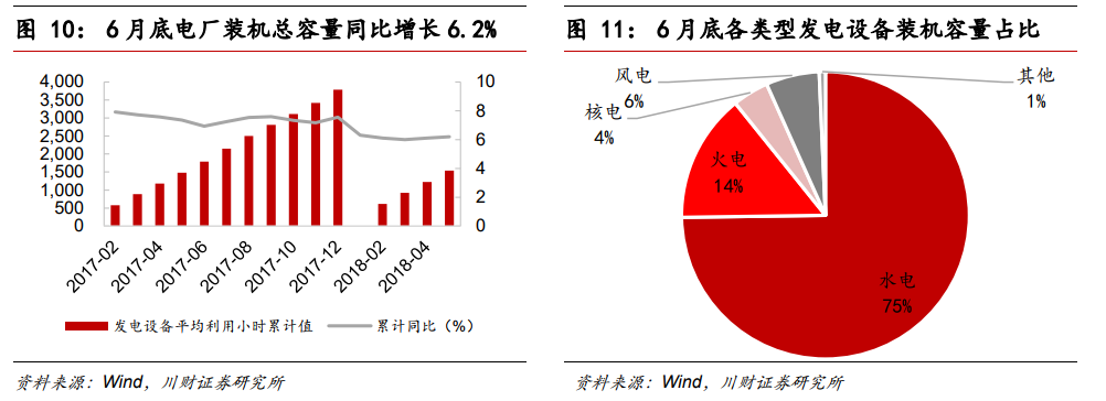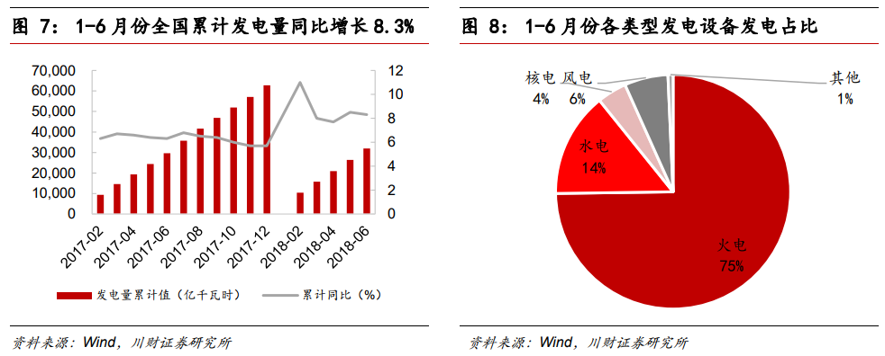 發(fā)電量方面:2018 年 1-6 月份,全國(guó)規(guī)模以上電廠發(fā)電量 31945 億千瓦時(shí),同比增長(zhǎng) 8.3%,增速比上年同期提高 2.0 個(gè)百分點(diǎn);火電發(fā)電量 23887 億千瓦時(shí),同比增長(zhǎng) 8.0%,增速比上年同期提高 0.9 個(gè)百分點(diǎn);水電發(fā)電量 4618 億千瓦時(shí),同比增長(zhǎng) 2.9%,增速比上年同期提高 7.1 個(gè)百分點(diǎn);核電發(fā)電量 1300 億千瓦時(shí),同比增長(zhǎng) 12.7%,增速比上年同期回落 6.9 個(gè)百分點(diǎn);風(fēng)電發(fā)電量 1917 億千瓦時(shí),同比增長(zhǎng) 28.6%,增速比上年同期提高 7.7 個(gè)百分點(diǎn)。受益于用電負(fù)荷的增長(zhǎng),全國(guó)發(fā)電量保持較快增長(zhǎng),作為最大負(fù)荷的火電發(fā)電量增速保持較快增長(zhǎng);今年以來(lái)來(lái)水情況較去年同期稍好,水電發(fā)電量同比增加。