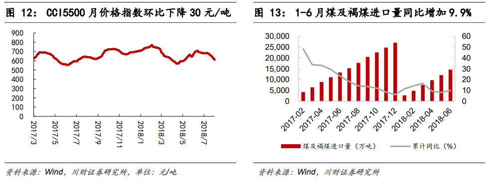 煤炭方面:截至 2018 年 7 月 31 日,CCI5500(含稅)動(dòng)力煤價(jià)格指數(shù)為 610 元/噸,月平均價(jià)格指數(shù)為 661.86 元/噸,環(huán)比下降 30.19 元/噸;截止 6 月我國(guó)煤及褐煤進(jìn)口量 14619 萬(wàn)噸,同比增長(zhǎng) 9.9%。