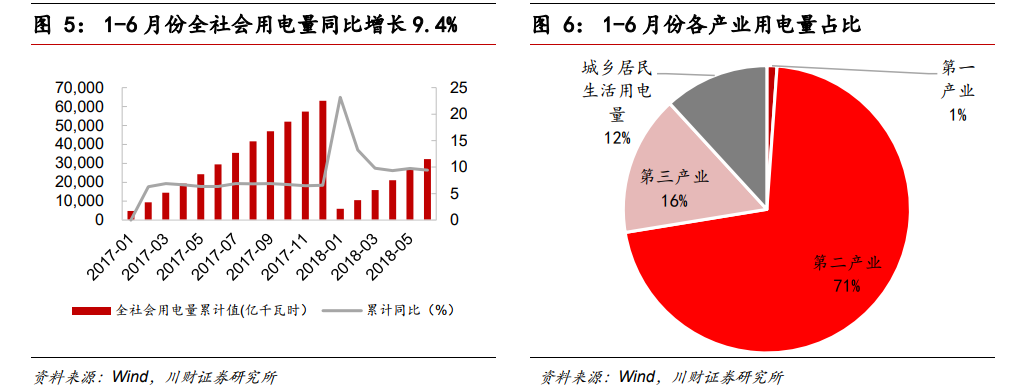 用電量方面:2018 年 1-6 月份,全國(guó)全社會(huì)用電量 32291 億千瓦時(shí),同比增長(zhǎng) 9.4%,增速比上年同期提高 3.1 個(gè)百分點(diǎn);分產(chǎn)業(yè)看,1-6 月份,第一產(chǎn)業(yè)用電量 328 億千瓦時(shí),同比增長(zhǎng) 10.3%,對(duì)全社會(huì)用電量增長(zhǎng)的貢獻(xiàn)率為 1.1%,占全社會(huì)用電量的比重為 1.0%;第二產(chǎn)業(yè)用電量 22336 億千瓦時(shí),同比增長(zhǎng) 7.6%,對(duì)全社會(huì)用電量增長(zhǎng)的貢獻(xiàn)率為 56.5%,占全社會(huì)用電量的比重為 69.2%,對(duì)全社會(huì)用電量增長(zhǎng)的貢獻(xiàn)率為 55.6%,占全社會(huì)用電量的比重為 72.8%;第三產(chǎn)業(yè)用電量 5071 億千瓦時(shí),同比增長(zhǎng) 14.7%,對(duì)全社會(huì)用電量增長(zhǎng)的貢獻(xiàn)率為 23.4%,占全社會(huì)用電量的比重為 15.7%,;城鄉(xiāng)居民生活用電量 4555 億千瓦時(shí),同比增長(zhǎng) 13.2%,對(duì)全社會(huì)用電量增長(zhǎng)的貢獻(xiàn)率為 19.0%,占全社會(huì)用電量的比重為 14.1%??傮w來(lái)看,全社會(huì)用電量累計(jì)增速同比提高,三產(chǎn)和城鄉(xiāng)居民用電快速增長(zhǎng);工業(yè)用電量較快增長(zhǎng),制造業(yè)日均用電量連續(xù)兩個(gè)月創(chuàng)歷史新高。
