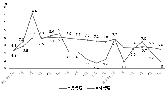 7月份,全省規(guī)模以上工業(yè)增加值同比增長1.8%,較上月回落2.4個百分點。1-7月,全省規(guī)模以上工業(yè)增加值同比增長5.5%,增速較上半年回落0.5個百分點。