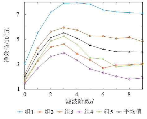 圖7為5組數(shù)據(jù)不同d值下的凈效益曲線,其中黑色曲線代表每個(gè)d值下5組ACE數(shù)據(jù)凈效益期望的平均值??梢姰?dāng)d=3時(shí),所得到的凈效益期望均值最大,為5.5萬元。