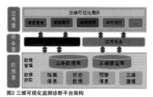 基于三維可視化的GIS局放在線監(jiān)測(cè)診斷平臺(tái)采用開(kāi)放式可擴(kuò)展的架構(gòu)設(shè)計(jì),系統(tǒng)架構(gòu)按照數(shù)據(jù)層、服務(wù)層、應(yīng)用層三層基本架構(gòu)設(shè)計(jì),如圖2所示。