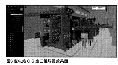 通過(guò)三維建模技術(shù)和可視化渲染技術(shù),構(gòu)建變電站場(chǎng)景、設(shè)備的三維數(shù)字模型場(chǎng)景,包括變電站設(shè)備、安裝的傳感器及站內(nèi)環(huán)境關(guān)鍵要素,如地面、天空、圍墻、房屋、通道、消防設(shè)施、標(biāo)識(shí)等,真實(shí)反映變電站設(shè)施設(shè)備細(xì)節(jié)和特征、空間關(guān)系,實(shí)現(xiàn)三維場(chǎng)景瀏覽、引導(dǎo)漫游及相關(guān)操作功能,可以360度任意三維互操作,呈現(xiàn)出真實(shí)場(chǎng)景,讓管理人員和技術(shù)人員直觀的了解變電站設(shè)施設(shè)備的具體情況。構(gòu)建的變電站GIS室三維場(chǎng)景如圖3所示。
