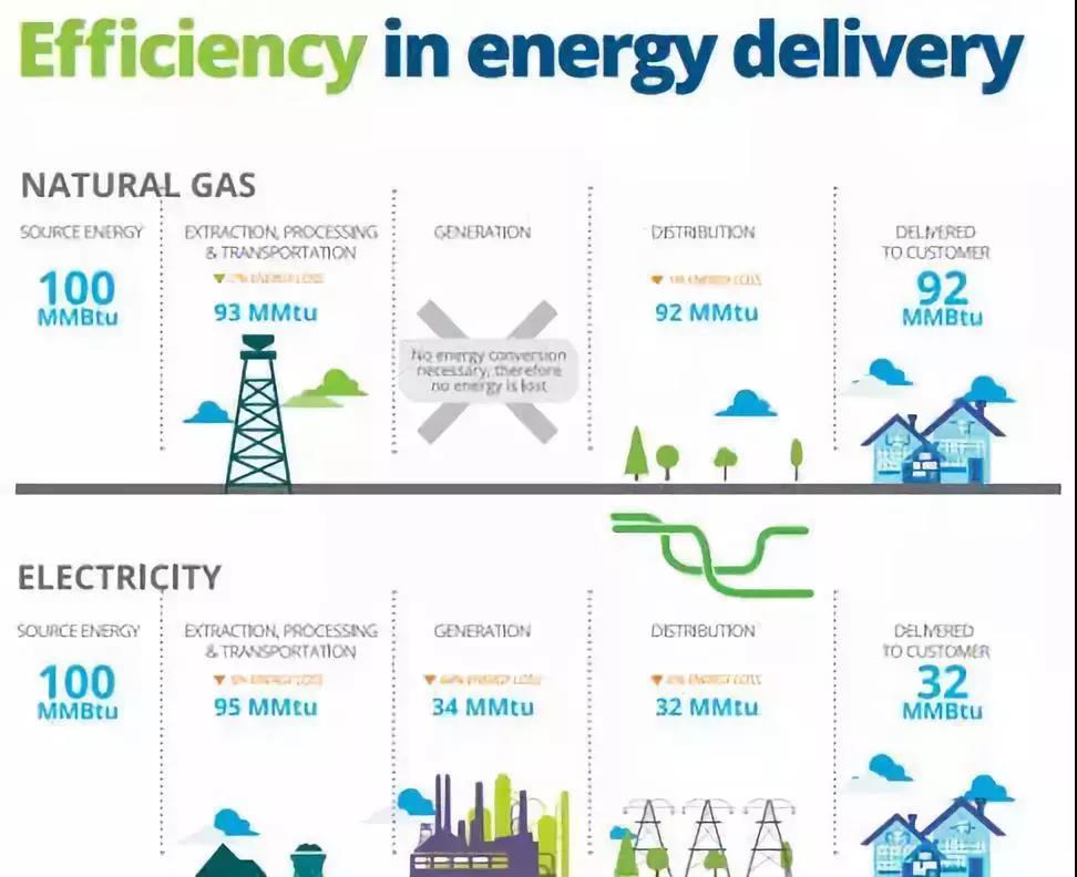 根據(jù)世界氣體協(xié)會(huì)(IGU)發(fā)布的《Natural Gas:The Energy for today and future 2017》的報(bào)告中,講述能源輸送的損失,100份天然氣到用戶可以獲得92份,而100份電力來(lái)源,輸送到用戶,只能獲得32份。