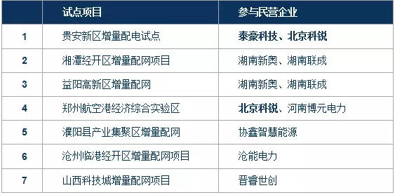 在國家電網(wǎng)經(jīng)營區(qū)域內(nèi),也產(chǎn)生了首家非國網(wǎng)控股的增量配電網(wǎng)業(yè)務試點項目產(chǎn)生,該項目是山西科技城綜合能源供應試點項目,由國家電網(wǎng)、管委會政府和社會資本共同成立,其中國家電網(wǎng)占股49%;民營企業(yè)協(xié)鑫參與的三個增量配網(wǎng)項目(安徽金寨、河南濮陽、江蘇揚中)均與國家電網(wǎng)所屬公司合作。