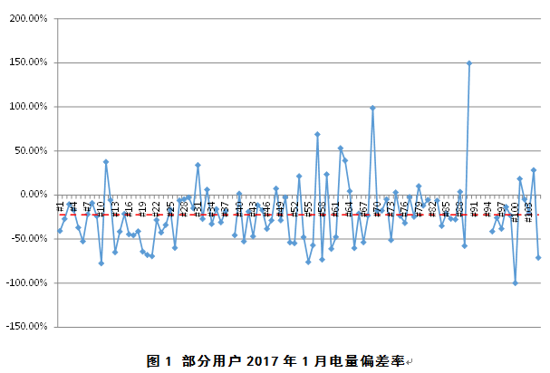 圖1為2017年1月電量偏差率,由于1月尚未開始月度競價,是根據(jù)1月實際用電量與2016年12月所簽訂年度長協(xié)合同中的1月分解電量的偏差來計算的。