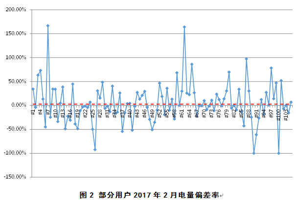 圖2為即為按《基本規(guī)則》計算的2月電量偏差率。1月偏差率最大為149.44%,最小為-100.00%(由于某種原因用電量為0),平均偏差為-22.46%(考慮正負值相抵消,如圖中紅色虛線所示),屬于系統(tǒng)性負偏差。2月偏差率最大為166.50%,最小為-100.00%(由于某種原因用電量為0),平均偏差為2.72%(考慮正負偏差電量相抵消,如圖中紅色虛線所示),僅略高于2%的允許正偏差。