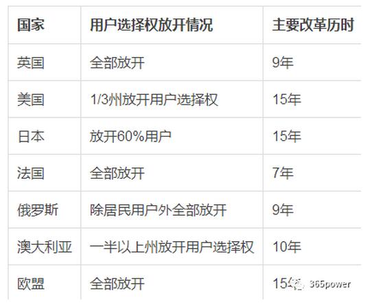分析世界各國的電力改革歷程,總體來看,售電側(cè)市場改革的核心任務(wù)是賦予用戶自由選擇權(quán)。通過放開用戶選擇權(quán),用戶可以自由選擇售電主體,對比售電主體的信用等級等,有利于形成售電市場的競爭機制,穩(wěn)定電價水平。各國的電力市場化改革情況與用戶選擇權(quán)的放開程度有關(guān),統(tǒng)計了國際電力市場化改革情況及歷時情況如下表所示。