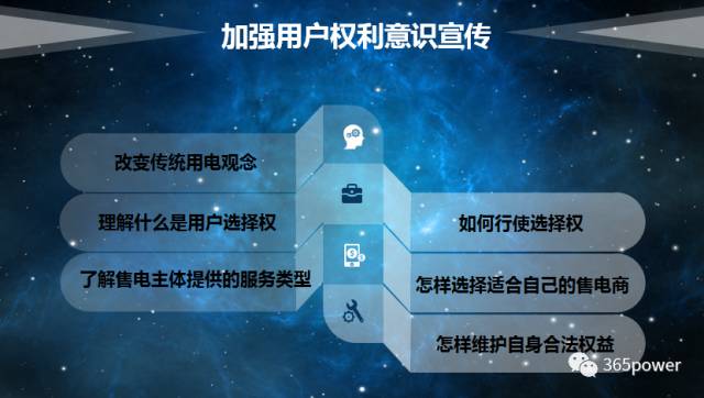 通過(guò)政府及電力主管部門(mén)在媒體、網(wǎng)絡(luò)等渠道地宣傳教育,使用戶理解并懂得行使其選擇權(quán),了解售電側(cè)改革對(duì)電力市場(chǎng)的有利影響,了解售電主體能夠提供的服務(wù)和自己受到保護(hù)的合法權(quán)力,了解如何對(duì)比分析并選擇最適合自己的售電商等。真正加強(qiáng)用戶權(quán)利意識(shí)的宣傳,才能是用戶更好的參與改革,形成積極活躍的市場(chǎng)化競(jìng)爭(zhēng)氛圍,確保售電側(cè)改革的持續(xù)發(fā)展。