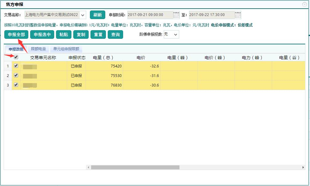 4、只需要填寫電量(總)、價(jià)差,其他的不需要填寫,點(diǎn)擊“申報(bào)全部”即可。