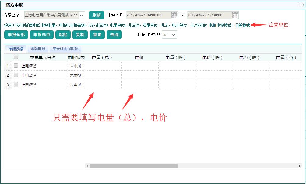 3、進(jìn)入到 “售方申報(bào)”界面,只需要申報(bào)電量(總)、價(jià)差。