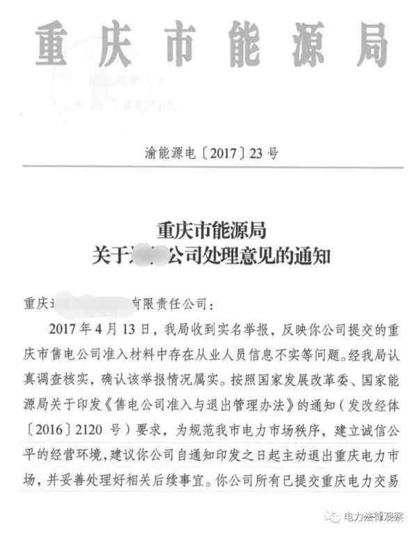 更需要引起小伙伴們注意的是該售電公司被驅(qū)逐的過(guò)程和原因:該公司遭到實(shí)名舉報(bào),反映該公司“提交的重慶市售電公司準(zhǔn)入材料中存在從業(yè)人員信息不實(shí)等問(wèn)題”,能源局調(diào)查“確認(rèn)該舉報(bào)情況屬實(shí)”,故而依據(jù)有關(guān)文件做出處理。