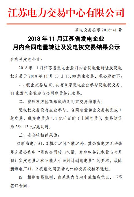 江蘇11月發(fā)電企業(yè)月內(nèi)合同電量轉(zhuǎn)讓及發(fā)電權(quán)交易:總成交電量4.1億度