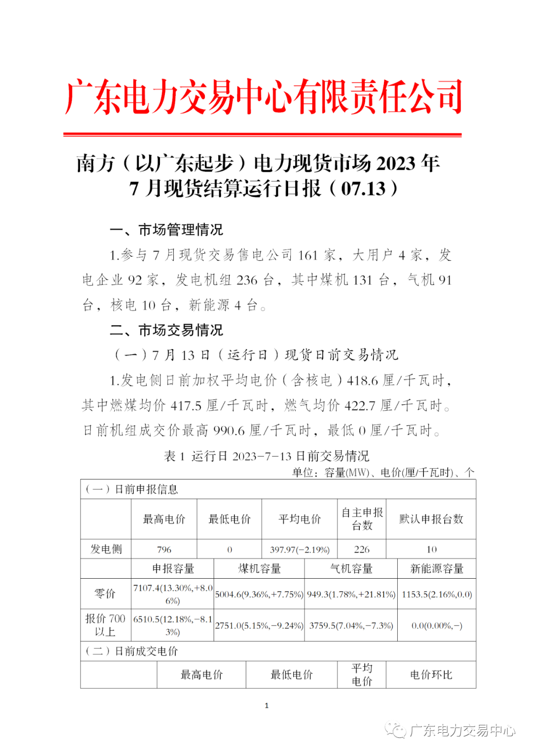 2023年7月13日南方(以廣東起步)電力現(xiàn)貨市場結(jié)算運(yùn)行日報(bào)