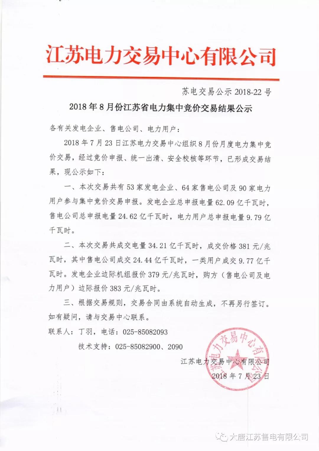 江蘇8月份月度競(jìng)價(jià)結(jié)果