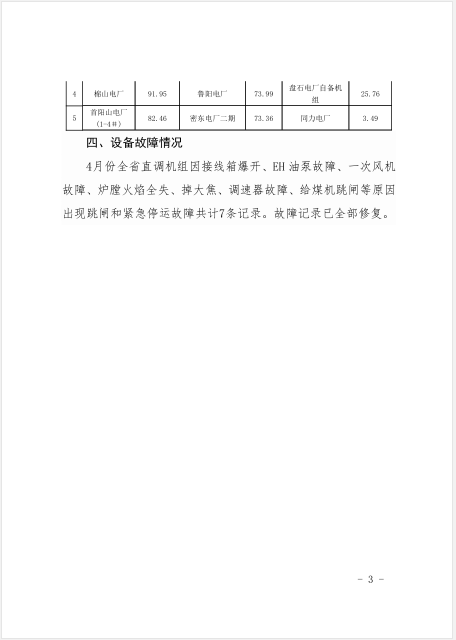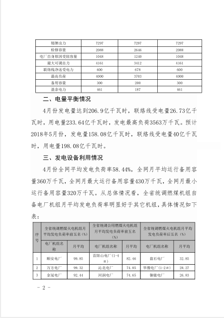 國(guó)家能源局河南監(jiān)管辦公室日前發(fā)布了《2018 年4月份河南電網(wǎng)調(diào)度運(yùn)行監(jiān)管信息分析》,其中一、電力平衡情況:4月份用電最高負(fù)荷出現(xiàn)在4日,達(dá)到3694萬(wàn)千瓦,較上月最高負(fù)荷減少396萬(wàn)千瓦,較去年同期最高負(fù)荷增加259萬(wàn)千瓦。二、電量平衡情況:4月份發(fā)電量達(dá)到206.9億千瓦時(shí),聯(lián)絡(luò)線受電量26.73億千瓦時(shí),用電量233.64億千瓦時(shí),發(fā)電最高負(fù)荷3563萬(wàn)千瓦。三、發(fā)電設(shè)備利用情況:4月份全網(wǎng)平均發(fā)電負(fù)荷率58.44%,全網(wǎng)月平均運(yùn)行備用容量360萬(wàn)千瓦,全網(wǎng)月最大運(yùn)行備用容量430萬(wàn)千瓦,全網(wǎng)月最小運(yùn)行備用容量320萬(wàn)千瓦。