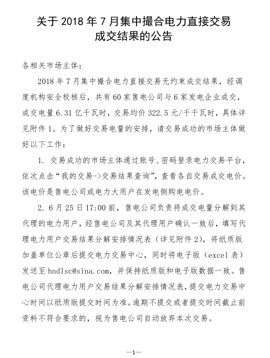 河南2018年7月集中撮合電力直接交易結(jié)果:成交電量6.31億千瓦時