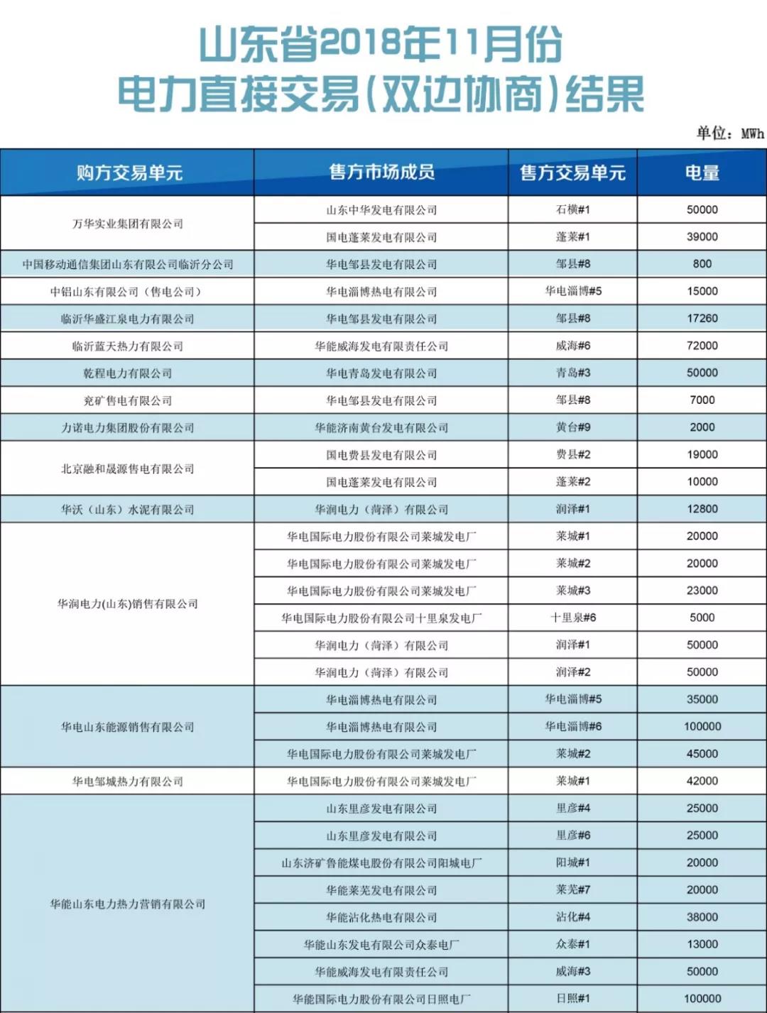 關(guān)于發(fā)布山東省2018年11月份電力直接交易(雙邊協(xié)商)結(jié)果的公告