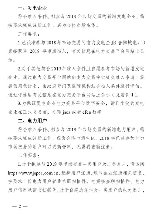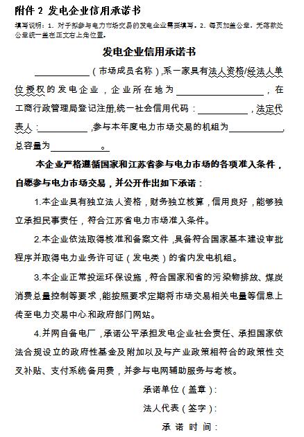 (二)擬參與江蘇電力市場交易的發(fā)電企業(yè)還需符合《江蘇省售電側(cè)改革試點(diǎn)實(shí)施細(xì)則》、《江蘇省電力中長期交易規(guī)則》中的準(zhǔn)入條件,向江蘇電力交易中心簽署信用承諾書。