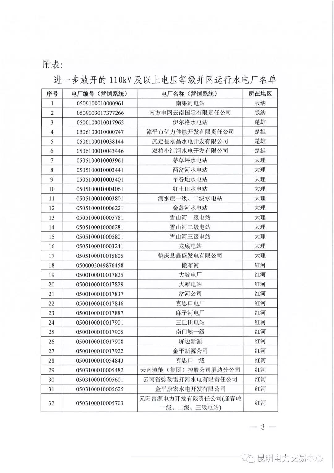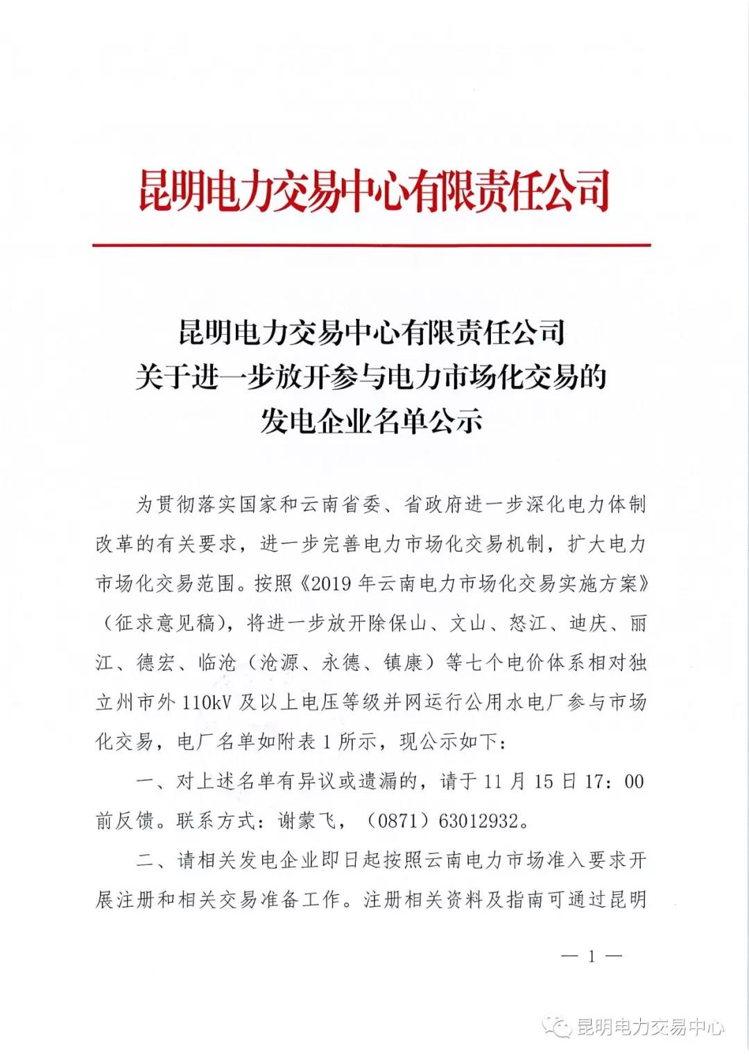 昆明電力交易中心有限責任公司關于進一步放開參與電力市場化交易的發(fā)電企業(yè)名單公示