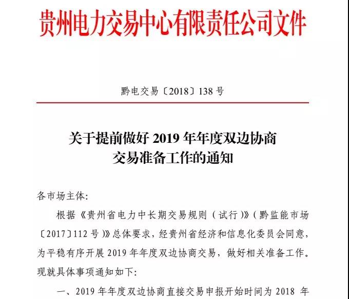 貴州關(guān)于提前做好2019 年年度雙邊協(xié)商交易準(zhǔn)備工作的通知