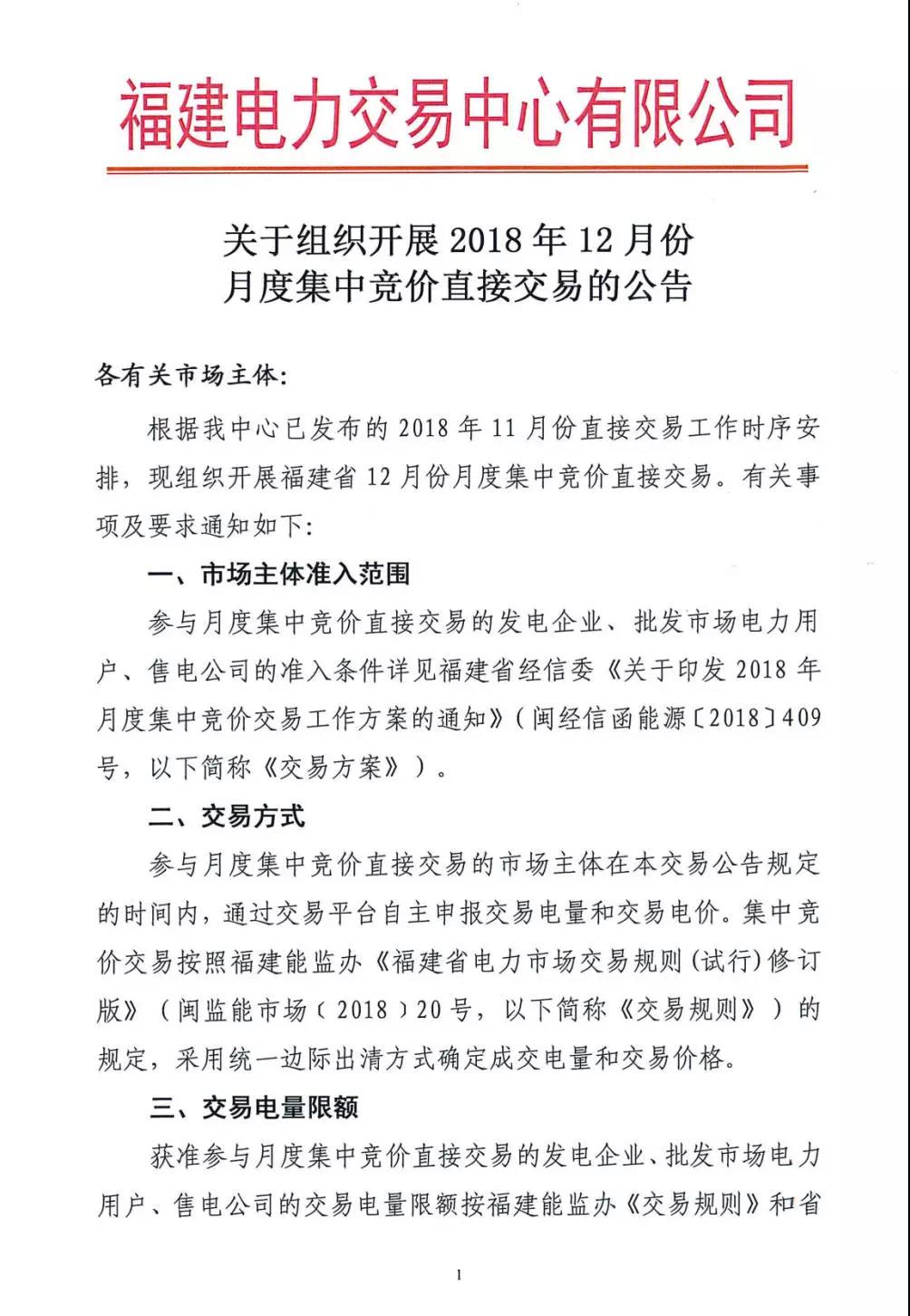 福建關(guān)于組織開(kāi)展2018年12月份月度集中競(jìng)價(jià)直接交易的公告
