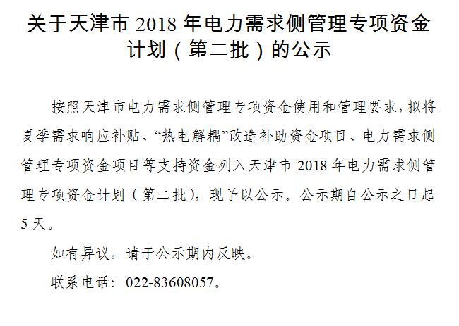 天津市《關于天津市2018年電力需求側管理專項資金計劃(第二批)的公示》,擬將夏季需求響應補貼357 11萬、“熱電解耦”改造補助資金項目810萬、電力需求側管理專項資金項目750萬共1917 11萬支持資金列入天津市2018年電力需求側管理專項資金計劃(第二批),現(xiàn)予以公示。