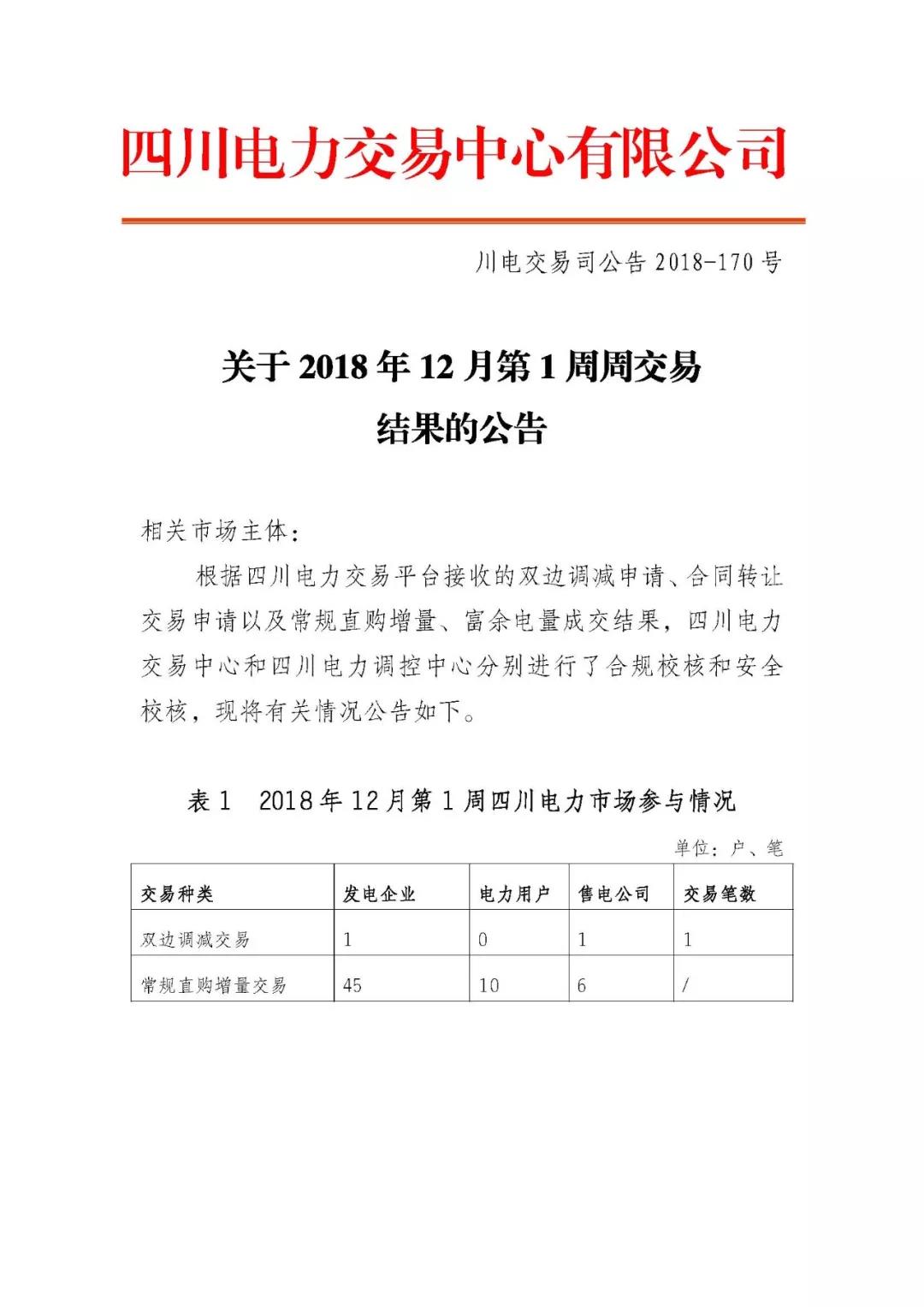 公告 | 四川關于2018年12月第1周周交易結果的公告