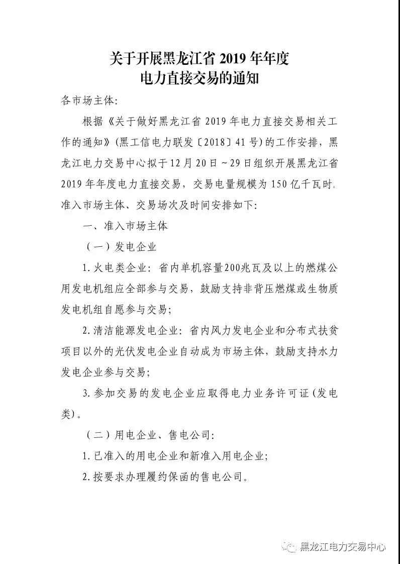 關于開展黑龍江省2019年年度電力直接交易的通知