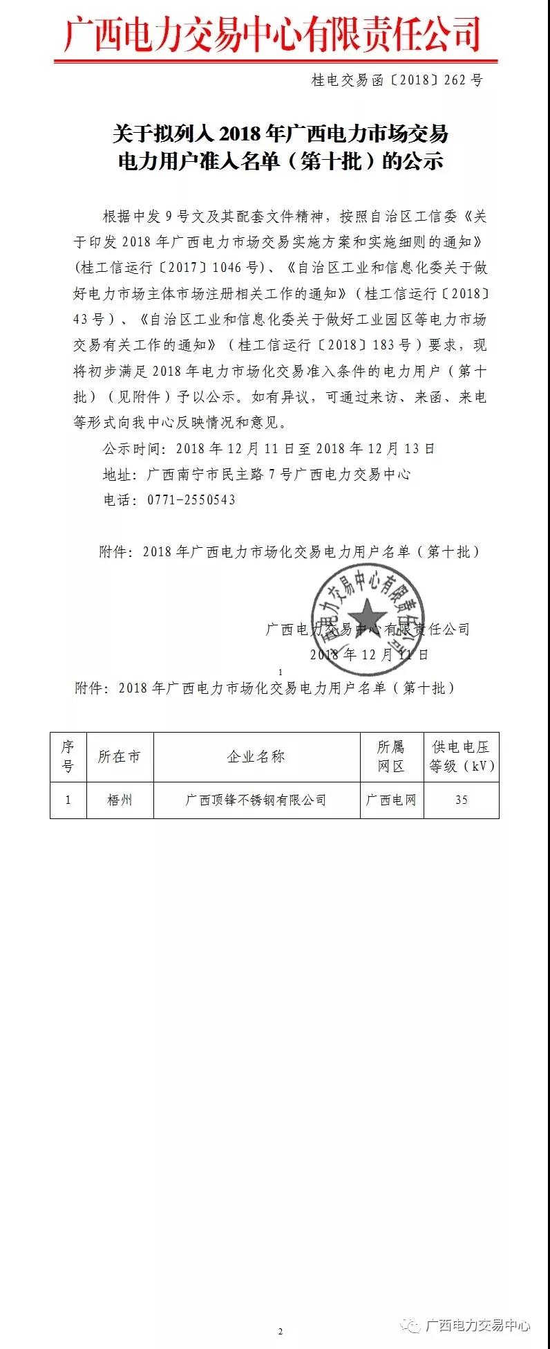 關(guān)于擬列入2018年廣西電力市場(chǎng)交易電力用戶準(zhǔn)入名單(第十批)的公示
