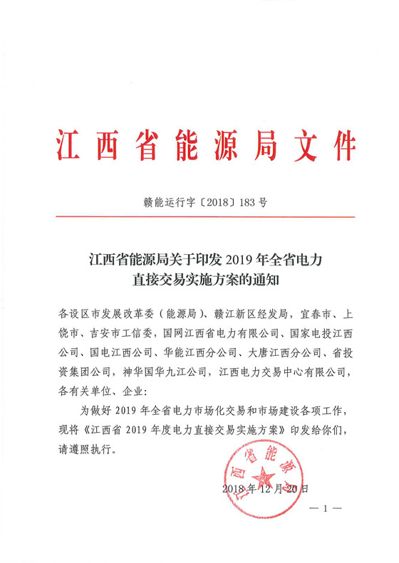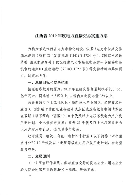 江西省能源局發(fā)布了《關(guān)于印發(fā)2019年全省電力直接交易實施方案的通知》