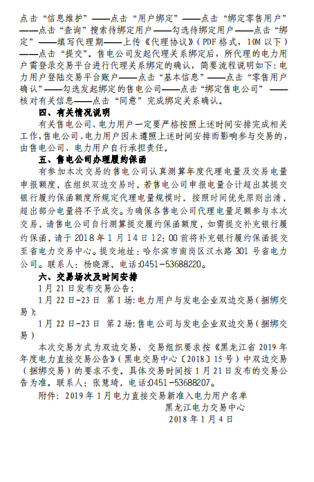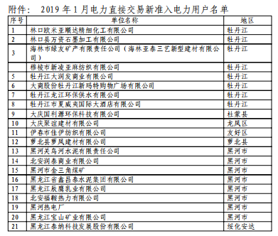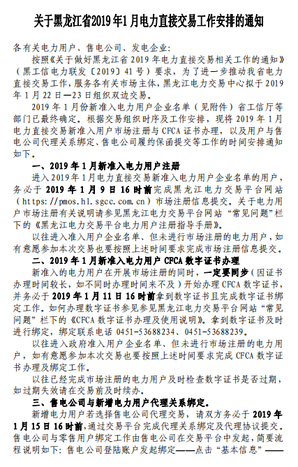 黑龍江電力交易中心發(fā)布了《關(guān)于黑龍江省2019年1月電力直接交易工作安排的通知》