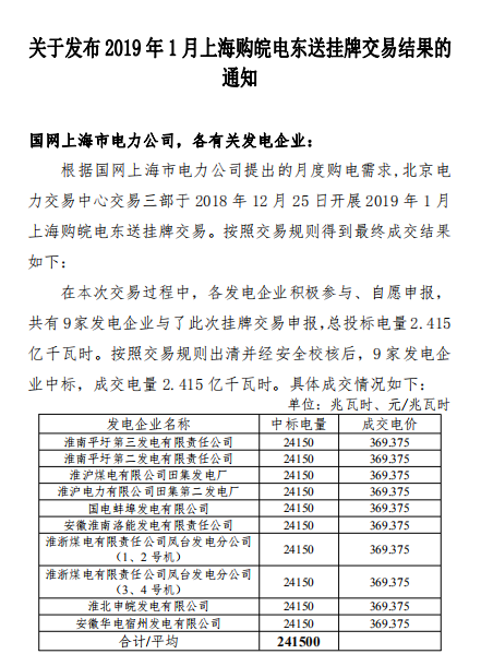 北京電力交易中心發(fā)布了《關(guān)于發(fā)布2019年1月上海購?fù)铍姈|送掛牌交易結(jié)果的通知》