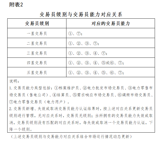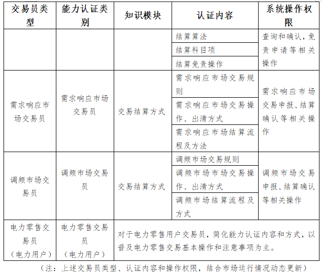 第十九條 初期,電力交易員類型分為檔案維護員、電力批發(fā)市場交易員、電力零售市場交易員(售電公司)、結(jié)算員、需求響應(yīng)市場交易員、調(diào)頻市場交易員、電力零售交易員共七種類型。各類交易員分別對應(yīng)一個交易員能力認證類別,詳見附表1。