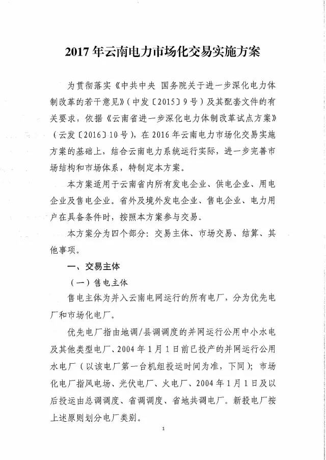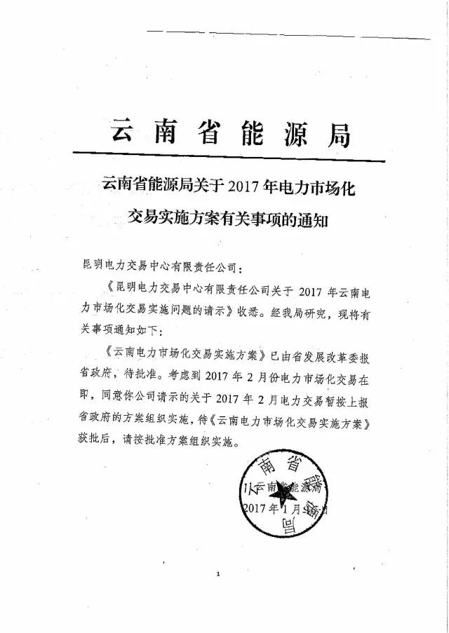 云南:關(guān)于2017年電力市場(chǎng)化交易實(shí)施方案有關(guān)事項(xiàng)的通知