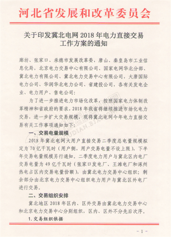 河北省發(fā)改委日前發(fā)布了《關(guān)于印發(fā)冀北電網(wǎng)2018年電力直接交易工作方案的通知》,通知中稱,2018年冀北電網(wǎng)大用戶直接交易二季度總電量規(guī)模...