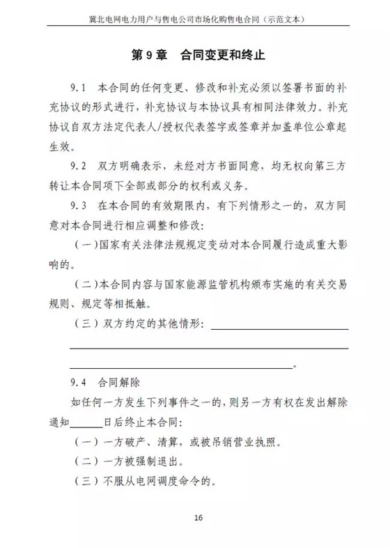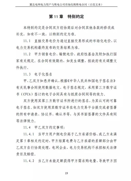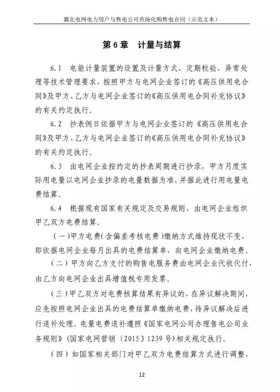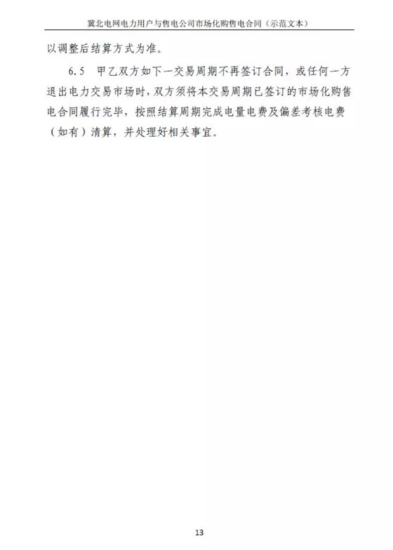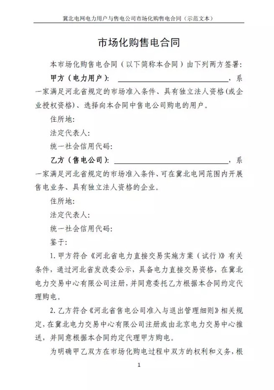 冀北電力交易中心日前發(fā)布了《冀北電網(wǎng)售電公司與電力用戶購售電合同示范文本的通知》,冀北電網(wǎng)區(qū)域內(nèi)電力用戶和售電公司達成市場化購電的代理意向時,應(yīng)參照《示范文本》簽訂市場化購售電合同。