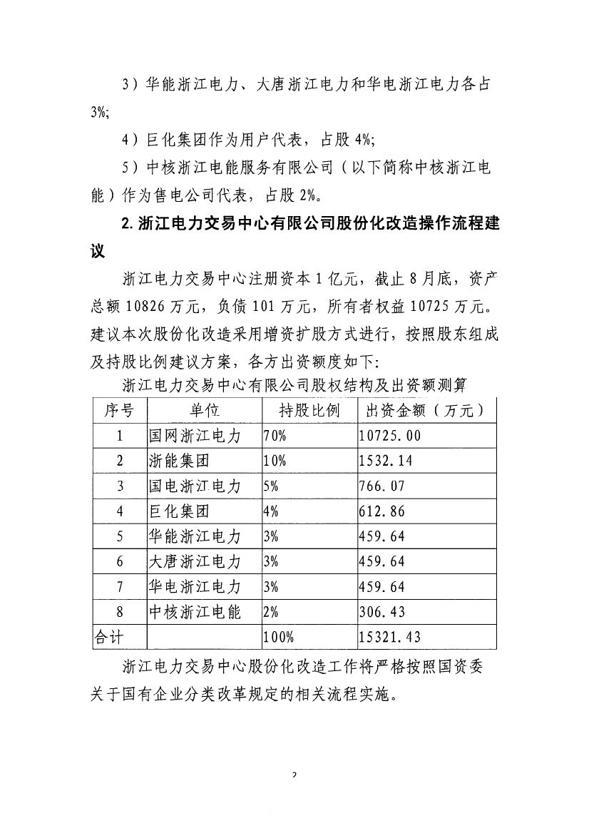 《浙江省電力交易中心有限公司股份化改造的建議方案》:國網(wǎng)浙江電力持股70% 7家非電網(wǎng)企業(yè)占30%