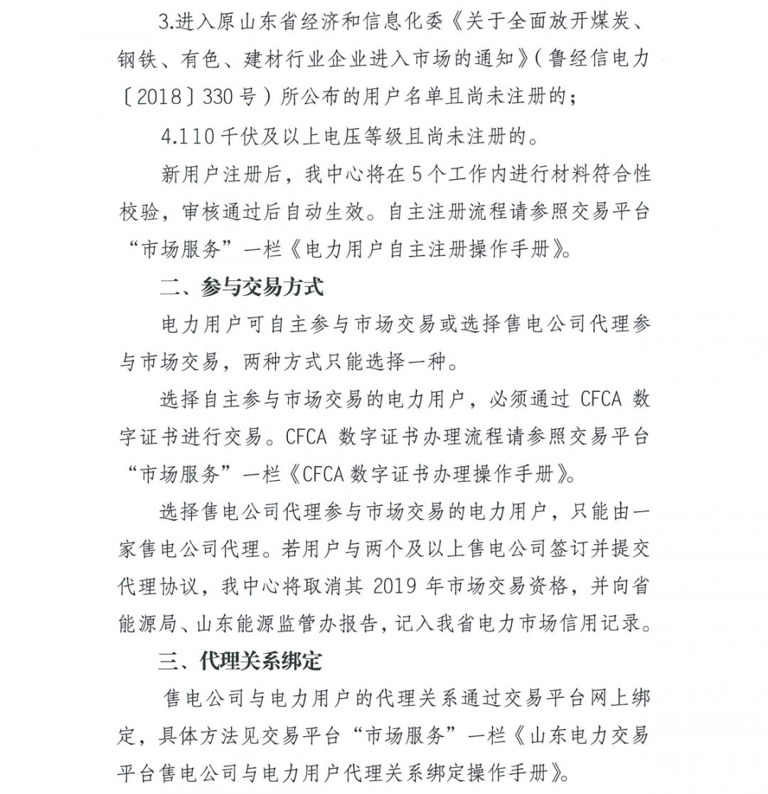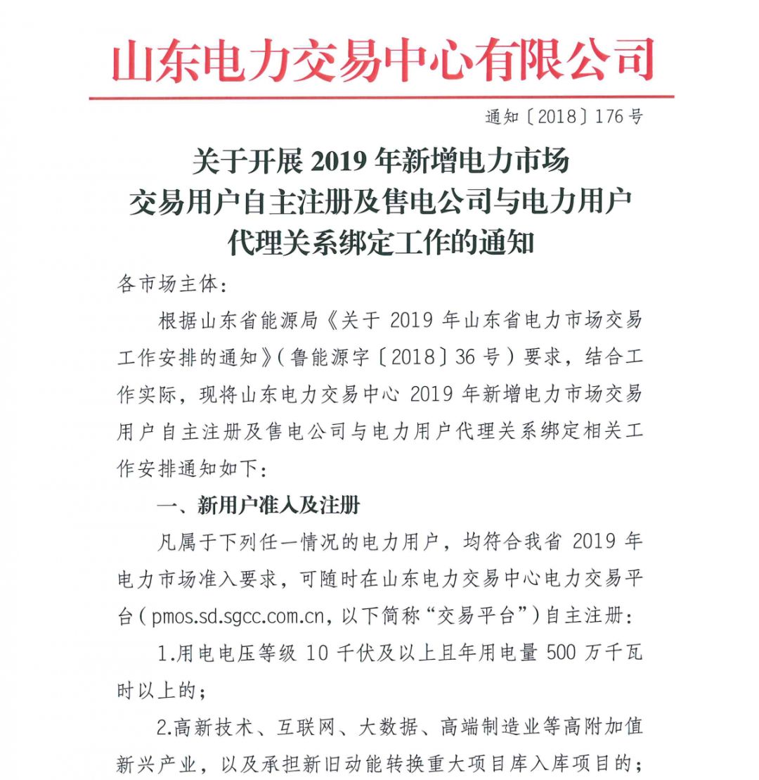 山東電力交易中心發(fā)布了《關(guān)于開展2019年新增電力市場交易用戶自主注冊及售電公司與電力用戶代理關(guān)系綁定工作的通知》