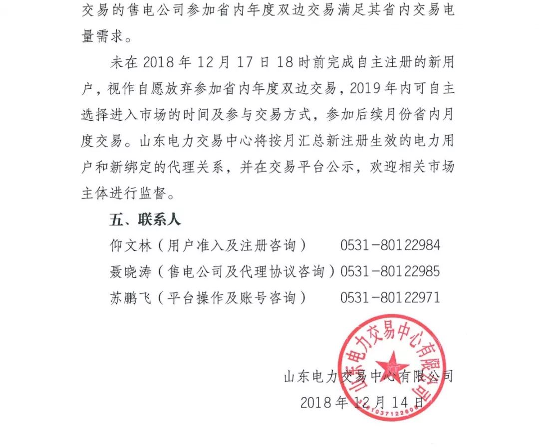 山東電力交易中心日前發(fā)布了《關(guān)于開展2019年新增電力市場交易用戶自主注冊及售電公司與電力用戶代理關(guān)系綁定工作的通知》,參加省內(nèi)年度雙邊交易的新用戶,應(yīng)在2018年12月17日18時前完成自主注冊。
